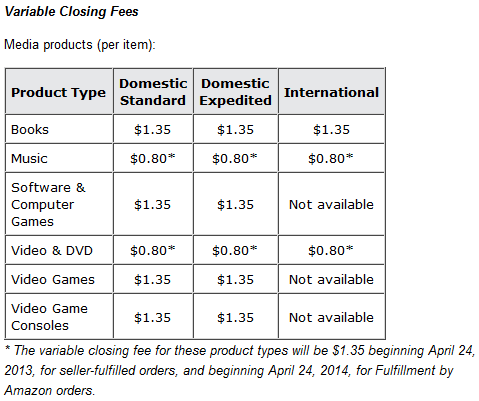 Formerly, the calculations we had been using for a product’s Referral and Variable Closing Fees were based on the information provided in Amazon’s publicly available fee schedule. According to this page, a Referral Fee is charged for the sale price of an item, though the page doesn’t specify whether the sale price includes the shipping price charged to the buyer. Furthermore, non-media products (products excluding Books, Music, DVDs, Software, Video Games, and Video Game Consoles) are shown to have a Variable Closing Fee that is based on weight and shipping method, while media products have a Variable Closing Fee that depends solely on shipping method.